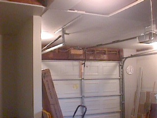 Well we are running out of projects. Having remodeled ever room in the house, it was time to start on the garage. The garage was constructed of 2x4's and the roof was hand framed using 2x6's. There were only 4 braces running from the outside wall to the side of the house for support of the roof and walls. A doubled 2x6 in the center and 2 other 2x6's spaced some 4+ feet apart. In order to add storage above the garage allot of additional support was needed. Five additional 2x6 rafters were added and cross braces placed using joist hangers to complete a grid of support. A floor was put down and a pull down ladder was put in to add easy access to the stuff stored above. A problem came by adding the additional rafters. The original support had sagged in the middle some 2 inches and the new supports were level. Putting drywall on the ceiling would have a wave effect if left as is. To correct the problem with the original rafters would have meant removing and replacing them. This was not an easy or time effective alternative. To solve the problem a grid of strings level with the lowest point of the rafters was laid out. Then a series of 1x2" firing strips were shimmed to the level of the strings. With a level surface, the ceiling drywall could now be hung. The result looked like everything was normal above. The back part of the garage roof was drywalled at the angle of the roof rafters giving a higher area to hang 3 bicycles. New lights and electrical outlets were added and new storage cabinets and the job was complete.